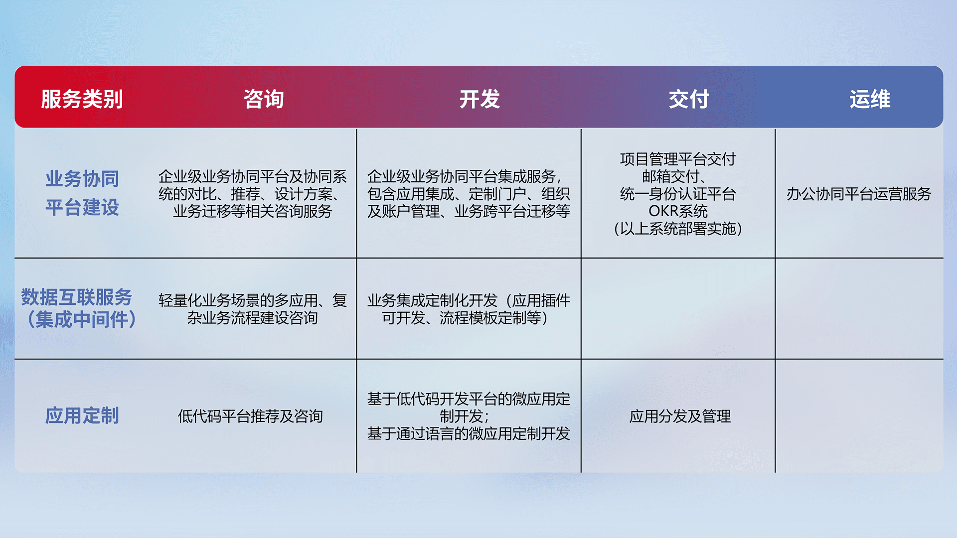 针对钉钉、、、、企微、、IDaas等平台级产品提供产品的规划、、、方案、、交付、、、、定制化开发等服务,,,实现如统一协同办公、、、智能客户服务、、、混合会议管理、、、智能数据查询、、、等业务场景,,实现数字化转型。。。。